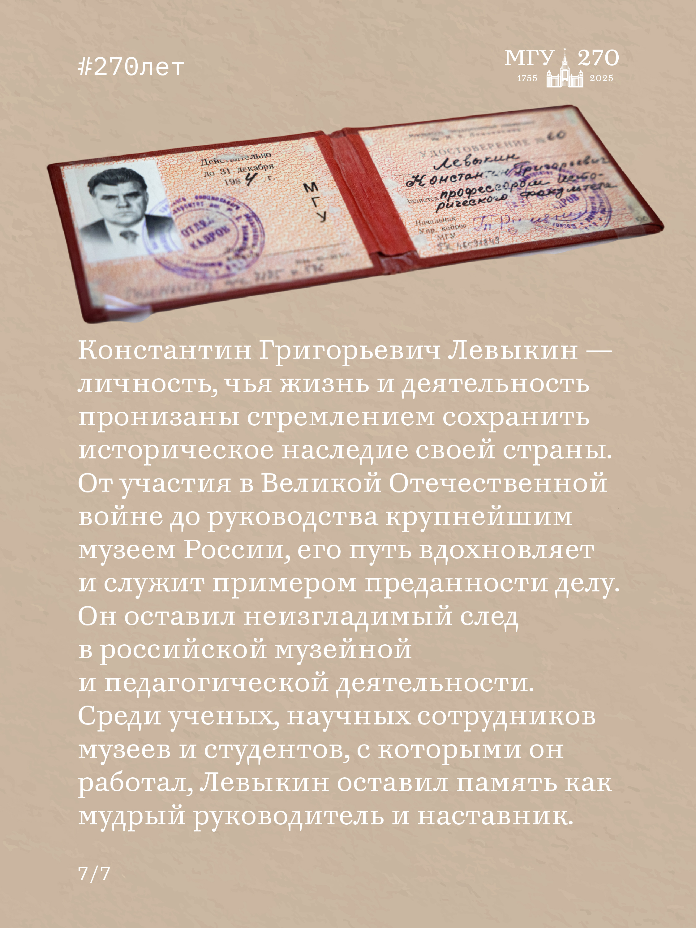 Константин Григорьевич Левыкин — личность, чья жизнь и деятельность пронизаны стремлением сохранить историческое наследие своей страны. От участия в Великой Отечественной войне до руководства крупнейшим музеем России, его путь вдохновляет и служит примером преданности делу.