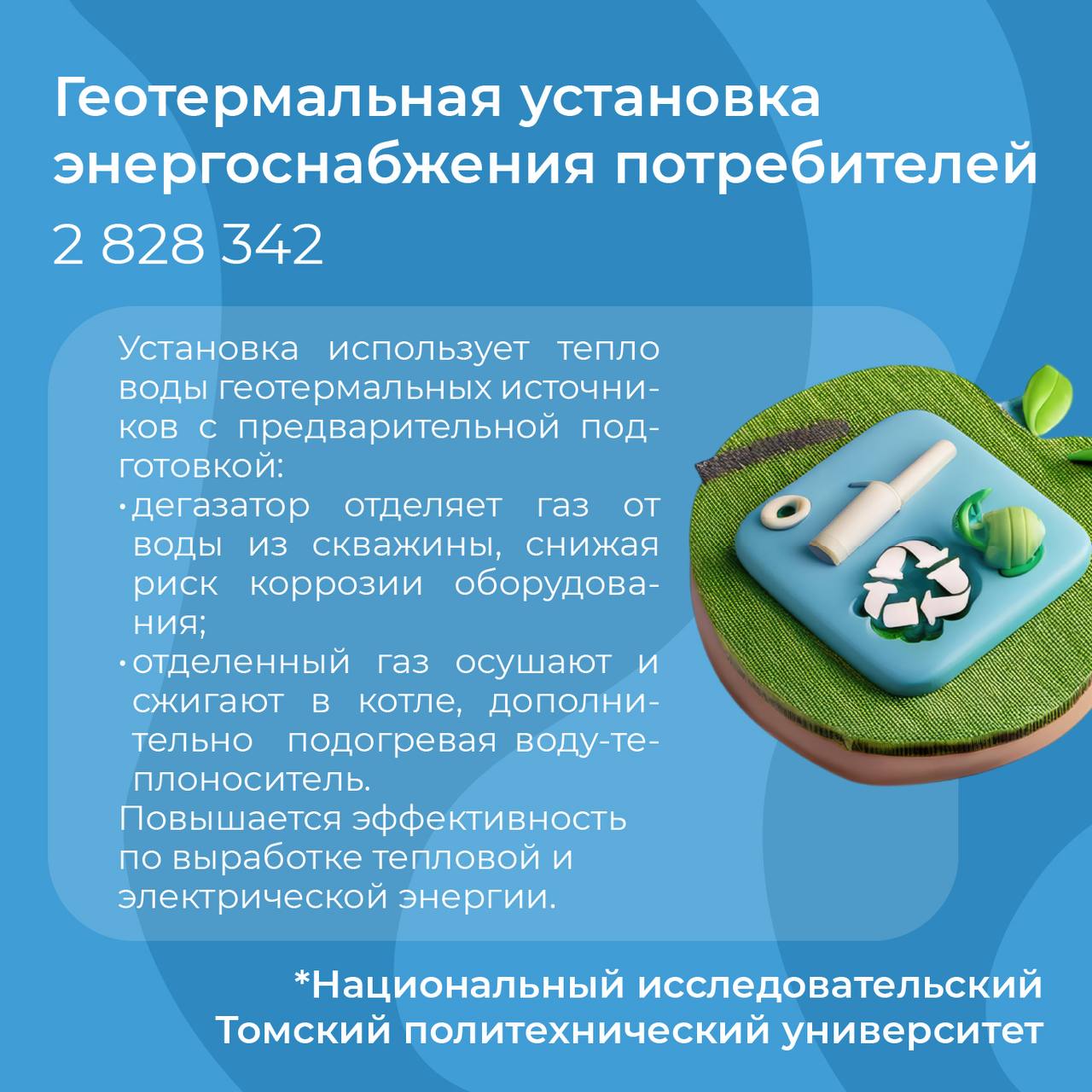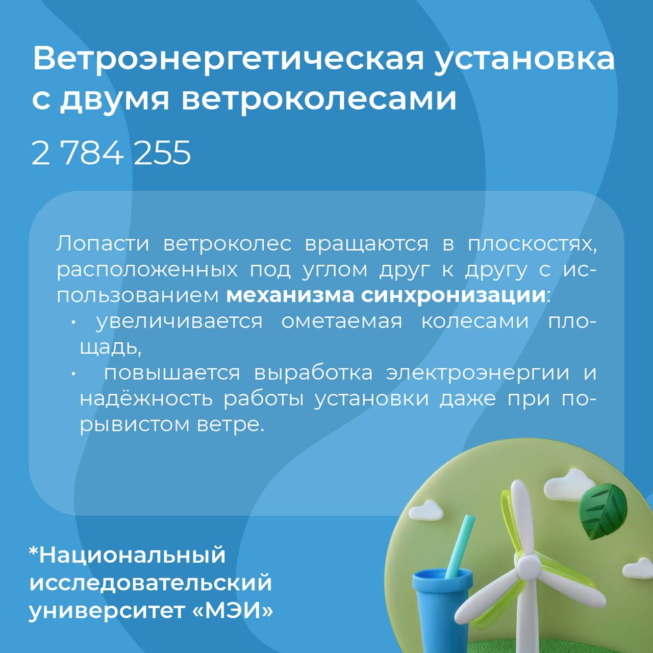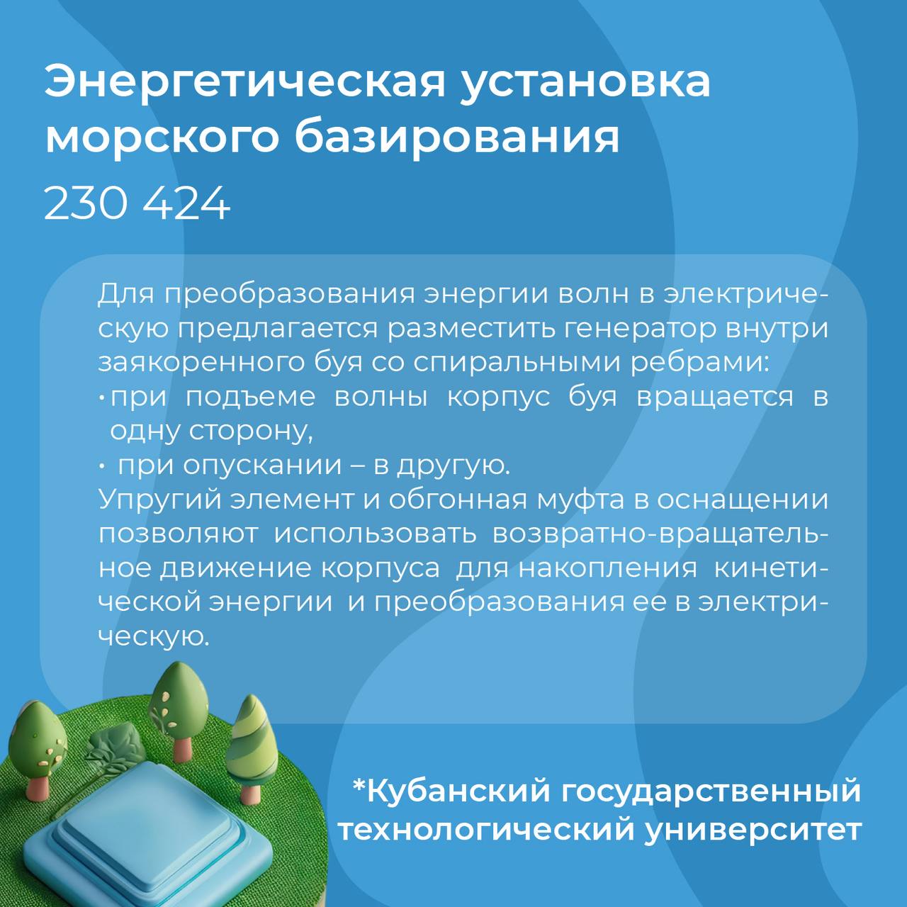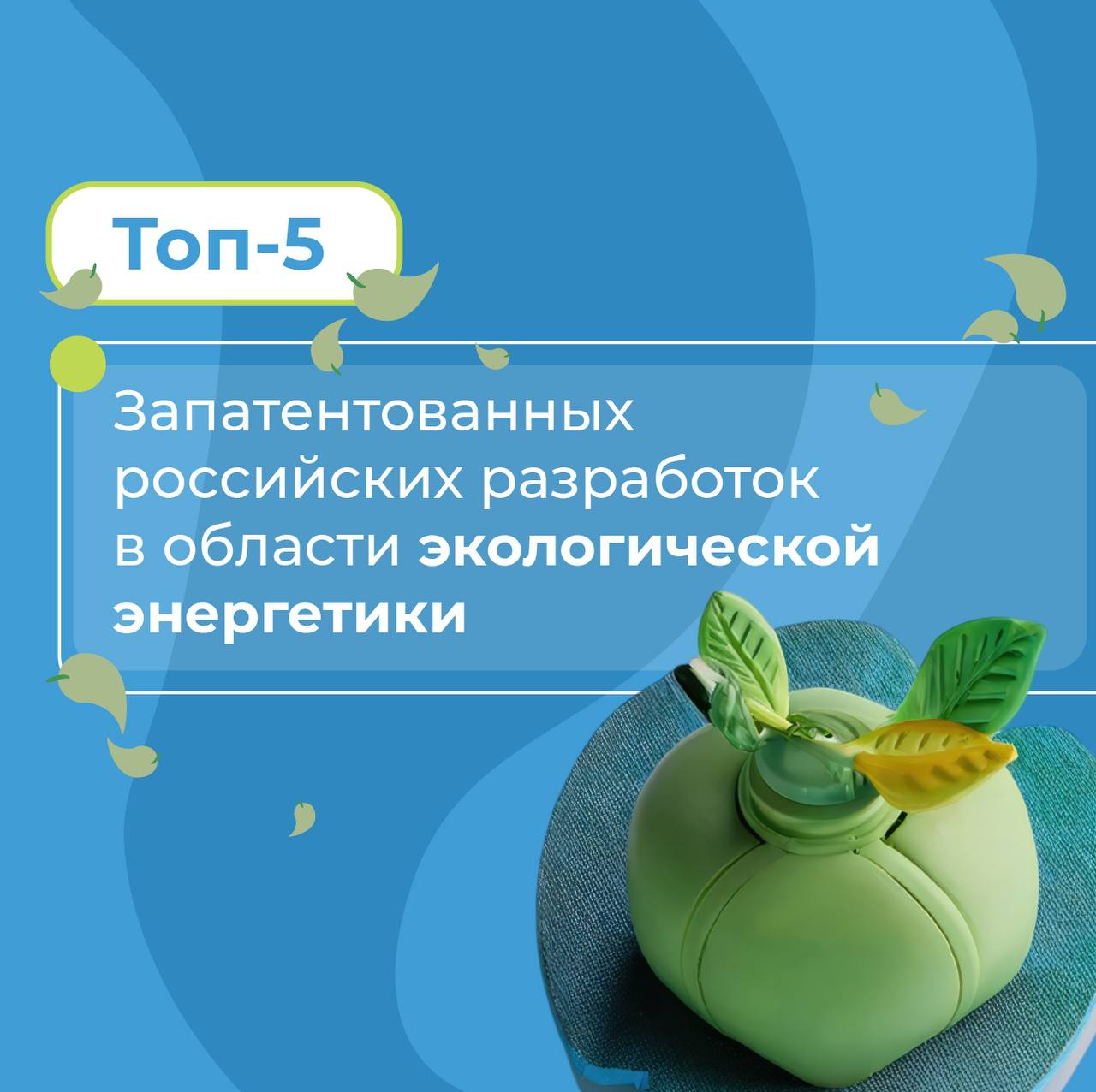 «В современном мире особую роль играют технологии, которые позволяют рационально использовать не только энергию, получаемую из топлива, но и другие энергоресурсы. Российские инноваторы в этом вопросе много внимания уделяют выработке альтернативной энергии – солнечной, ветровой, приливной», – отметил руководитель Роспатента Юрий Зубов.