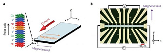 Ученые из ДВФУ совместно с иностранными коллегами предложили использовать нарушение зеркальной симметрии относительно пространственной инверсии при создании сверхпроводящего диода. Для этого в многослойную систему на основе ниобия (Nb) и ванадия (V), играющих роль сверхпроводящей среды, был введен слой ферромагнетика – кобальта (Co) толщиной 1,7 нм (см. рис.). Полученная магнетронным напылением многослойная пленка подвергалась микрообработке для формирования микропроволоки, к которой методом фотолитографии были сформированы и подведены контакты для измерения электрического сопротивления. В ходе эксперимента внешнее магнитное поле прикладывалось в плоскости многослойной пленки в направлении, ортогональном току, и использовалось для управления направлением намагниченности слоя Co. Такая геометрия позволила исследовать зависимость электрического сопротивления от постоянного тока при изменении магнитного состояния ферромагнетика.