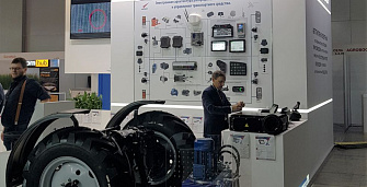 Универсальный автопилот способен управлять сельскохозяйственной машиной двумя способами: как с помощью гидрораспределителей, так и подруливающего устройства, которое устанавливается на рулевой вал. На стенде НПО автоматики выставлен передний мост трактора, колеса имитируют движение в поле согласно заданной траектории.