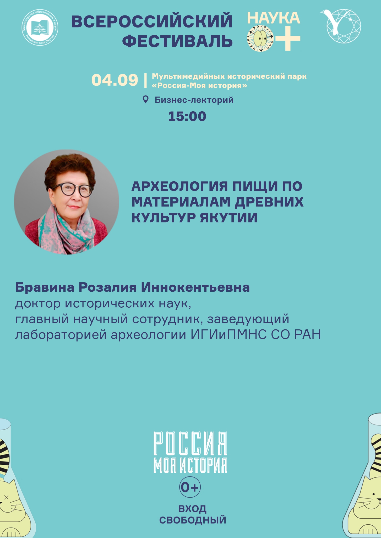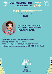 "Лекция посвящена знакомству слушателей с опытом использования методов гуманитарных и естественных наук для восстановления рациона питания древнего населения Якутии. В ходе лекции даётся интерпретация археологических материалов, полученных в результате раскопок стоянок, поселений и захоронений в период от каменного века до Нового времени.