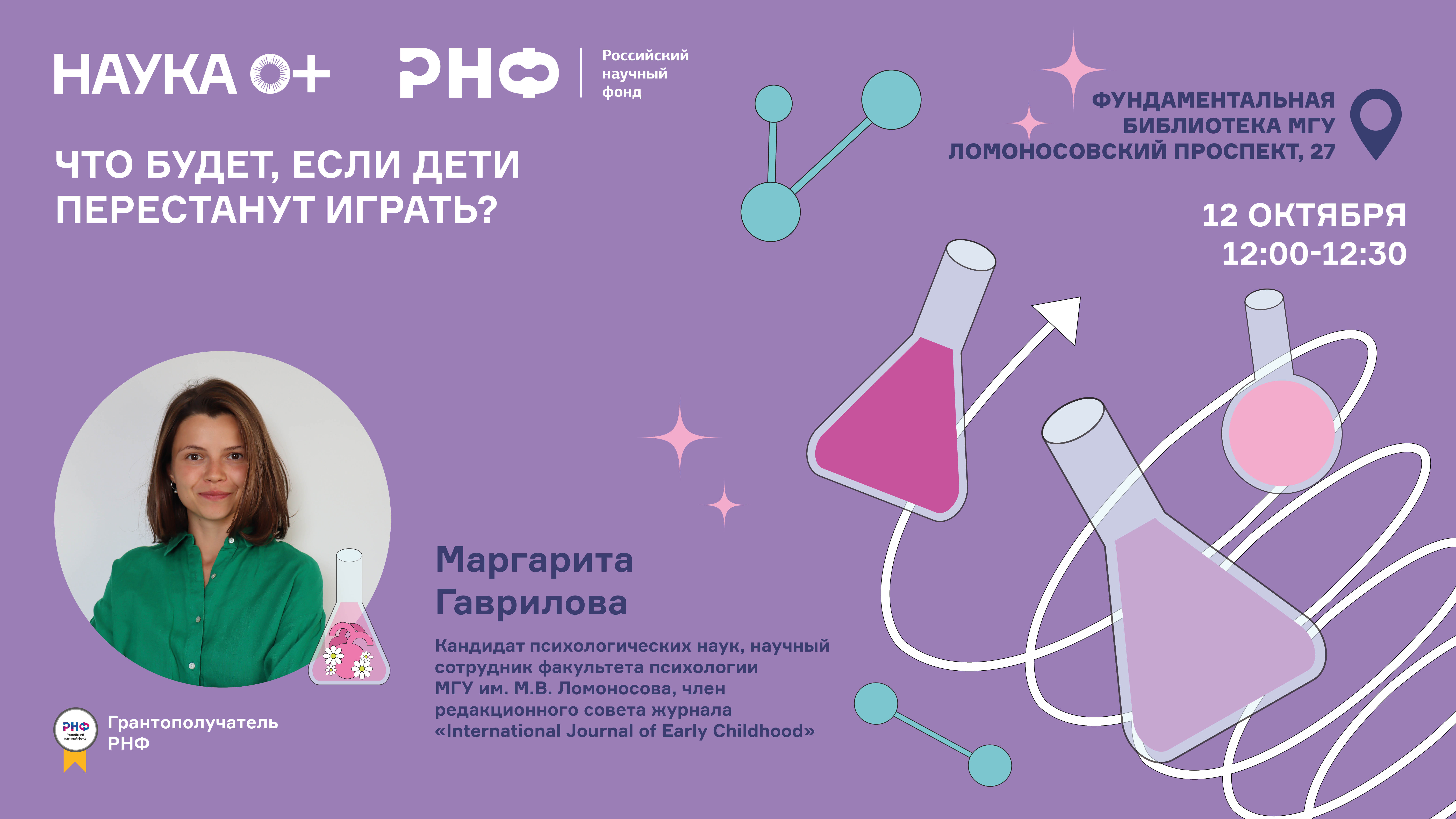 Почему ученые во всем мире озадачены сохранением детской игры? Кто или что ей угрожает и к чему может привести ее исчезновение? Ответы на эти и некоторые другие вопросы вы получите на лекции Маргариты Гавриловой, кандидата психологических наук, научного сотрудника факультета психологии МГУ им. М.В. Ломоносова, члена редакционного совета журнала «International Journal of Early Childhood». Лектор расскажет о результатах современных исследований и поделится профессиональным взглядом о будущем игры, покажет, как психологи смотрят на вопросы развития ребенка.