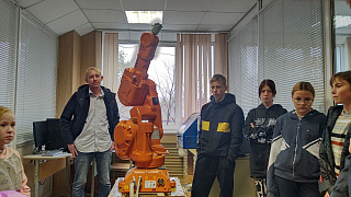 Экскурсия в лабораторию робототехники включает демонстрацию промышленных роботов-манипуляторов и мобильных транспортных роботов.