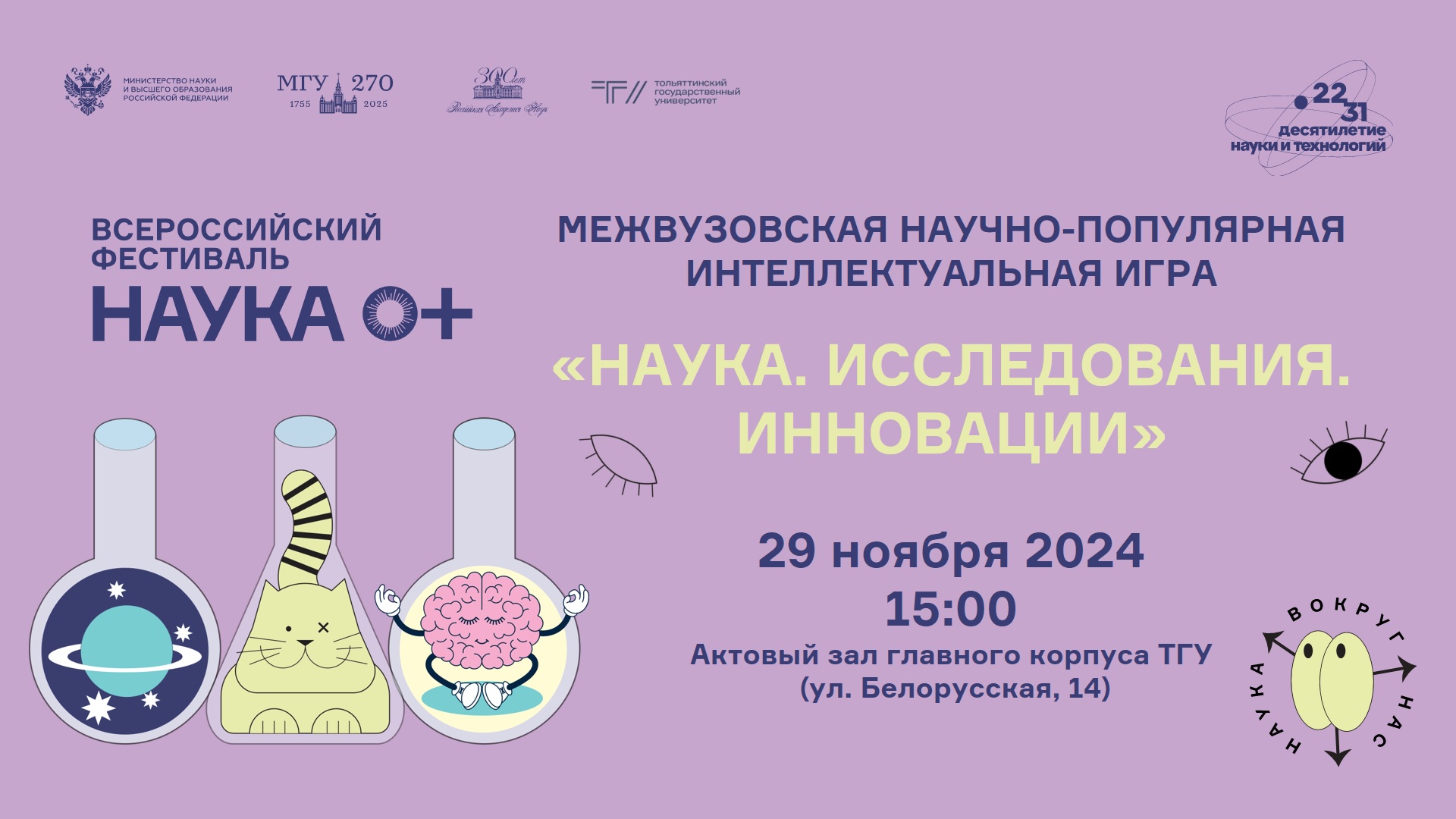 В межвузовской научной интеллектуальной игре «Наука. Исследования. Инновации» игре принимают участие команды студентов (специалитет, бакалавриат, магистратура), любых образовательных организаций высшего и профессионального образования г.о. Тольятти. Игра состоит из раундов с вопросами на эрудицию, логику, интуицию, внимание и чувство юмора по теме науки, исследований и инноваций. Каждый раунд проводится в новом формате - в виде картинки, видео, аудиофрагмента, тура про кино, аукциона или блица.