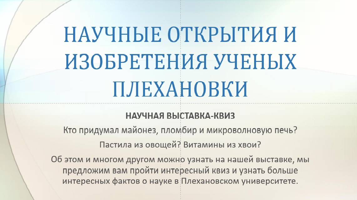 На примере деятельности выдающихся ученых Московского коммерческого института (Московского института народного хозяйства, Российского экономического университета имени Г.В. Плеханова) показывается их вклад в развитие отечественной науки в разные времена и эпохи, за весь период существования учебного заведения. Плехановцы совершили важные открытия в области экономической теории, товароведения, пищевой инженерии, технологии обработки и консервации различных видов продовольственных товаров. На выставке мы расскажем, кто и когда изобрел майонез, сухое молоко, пломбир, микроволновую печь и многие другие товары и продукты. Сегодня ученые нашего университета продолжают вносить значимый вклад в российскую науку своими интересными и инновационными открытиями.