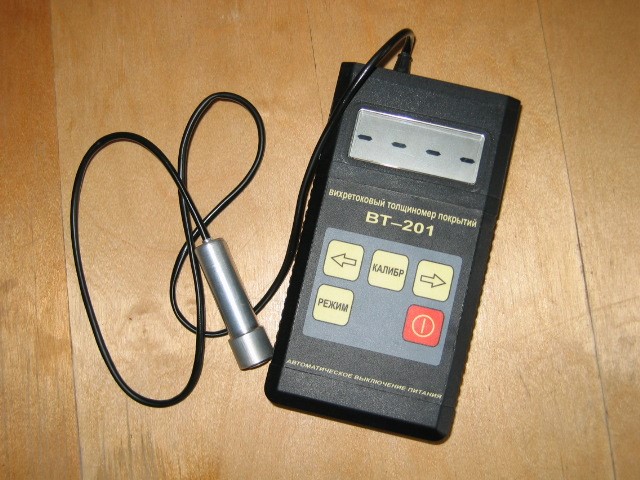 Определение толщины неметаллических покрытий производим с помощью вихретокового толщиномера ВТ-201. Данный прибор позволяет с высокой точностью измерить толщину материала или слоя покрытия материала (такого как краска, лак, грунт, шпаклёвка, ржавчина, толщину основной стенки металла, пластмасс, стекла, а также других неметаллических соединений, покрывающих металл) без нарушения его целостности.