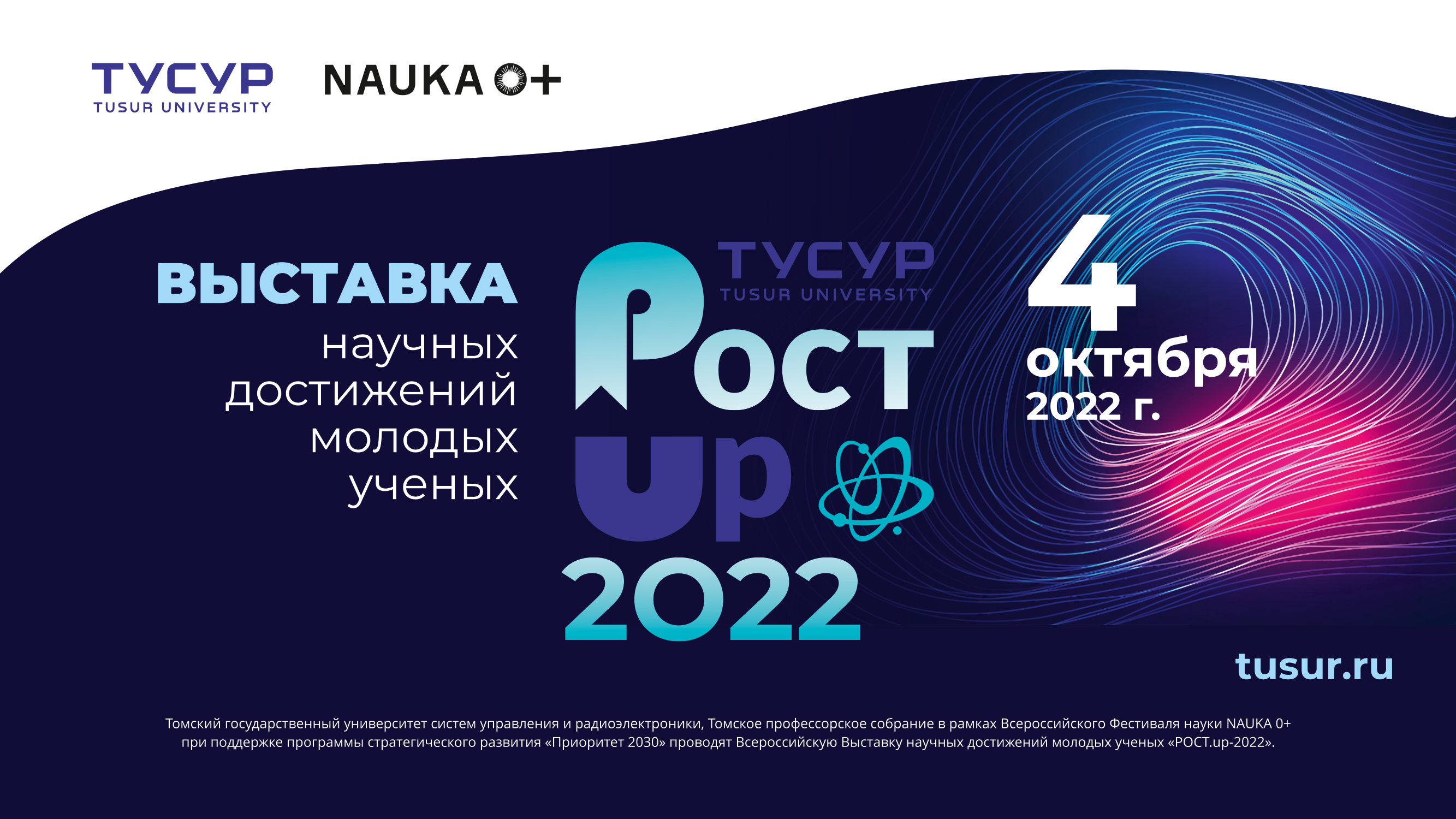 4 октября 2022 г. с 14:30 до 18:30 Томский государственный университет систем управления и радиоэлектроники, Томское профессорское собрание в рамках Всероссийского Фестиваля науки NAUKA 0+ при поддержке программы стратегического развития «Приоритет 2030» проводят Всероссийскую Выставку научных достижений молодых ученых «РОСТ.up 2022».