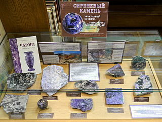 Выставка проводится в читальном зале геологического факультета библиотеки МГУ на 6-м этаже Главного здания. Представленные на выставке образцы пород месторождения Сиреневый камень отражают разнообразие чароитовых метасоматитов.