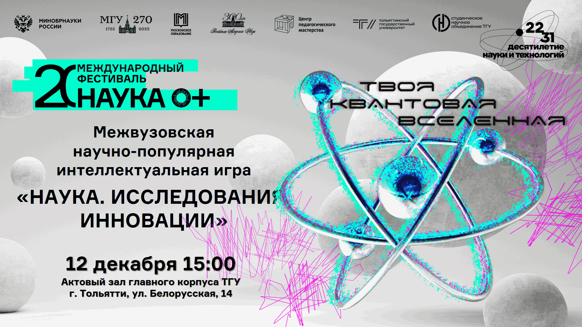 В игре принимают участие команды студентов (специалитет, бакалавриат, магистратура), команды аспирантов и молодых ученых любых образовательных организаций высшего и среднего профессионального образования г.о. Тольятти. Игра состоит из раундов с вопросами. Участникам предстоит ответить на вопросы, связанные с наукой, исследованиями и инновациями, опираясь на логику, интуицию, внимание и конечно чувство юмора. Каждый раунд проводится в новом формате - в виде картинки, видео, аудиофрагмента, тура про кино, аукциона или блица.